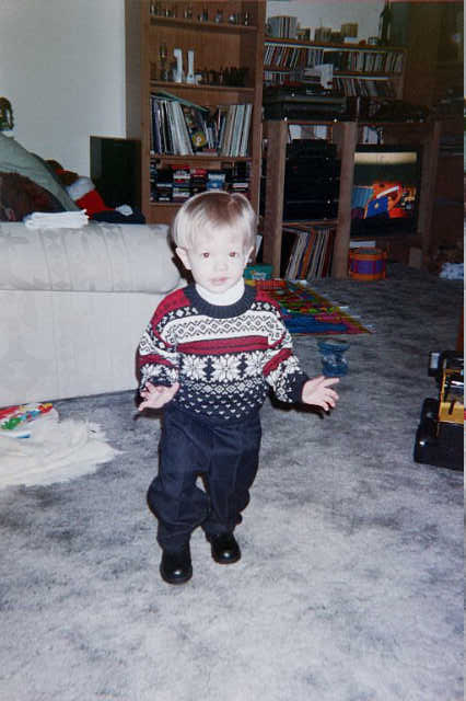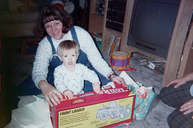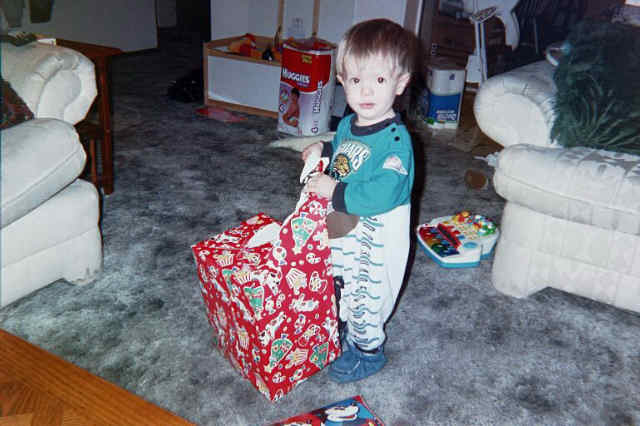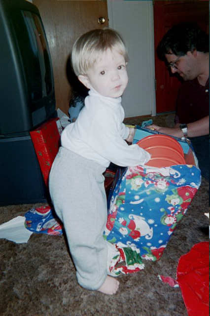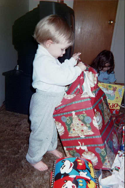 | Mom shows him how to open presents. |